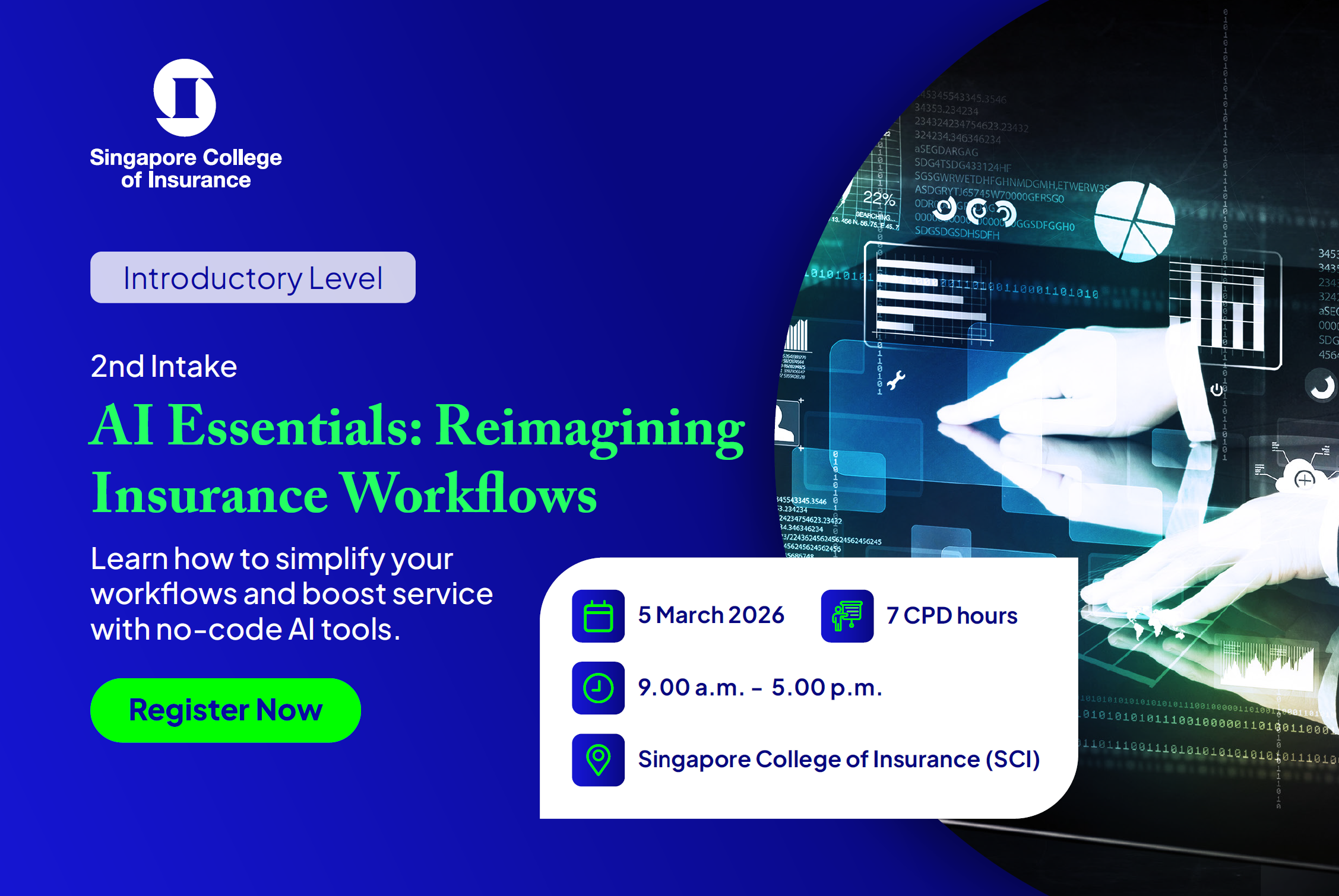 This intensive one-day workshop introduces insurance professionals to the next stage of digital transformation: AI-driven workflows that automate repetitive tasks, accelerate decision-making, and enhance service quality.
